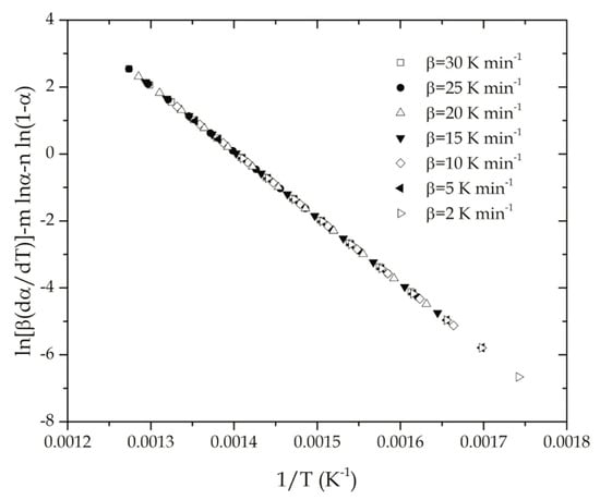 If Equation (26) is included into Equation (24) and the terms are rearranged, it gives Equation (27). An optimization of the Pearson’s linear correlation coefficient can be considered as the objective to obtain the optimum m and n values that allow a linear fit between the left-hand side part of Equation (27) against 1/T. Once m and n are obtained, the Ea and ln cA values can be obtained from the slope and intercept of the optimum linear fit, respectively, as reported by Sánchez-Jiménez et al. [35].