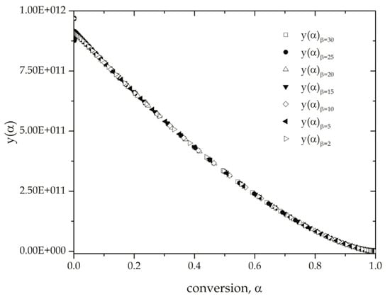Criado-Maqueda methodology is based on the use of master plots corresponding to different reaction models (Table 1). By comparison with experimental data, it is possible to elucidate the reaction model if it is unique, or in some cases, if it is based on two or more consecutive reaction models, depending on the conversion, . As previously stated, isoconversional models allow estimating the Ea in an accurate way but they do not give any information about the reaction model. Once Ea has been obtained, a y() function can be defined as shown in Equation (28), with x = Ea/RT representing the reduced temperature: