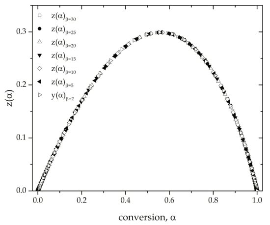 To give more consistency to this method, Criado-Maqueda also proposed the use of a z()-type function to represent the master curves corresponding to different reaction models that take into account both f() and its integral form g(). The z() function is defined in Equation (30), in which is related to the Arrhenius temperature integral:
