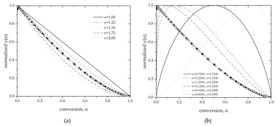 Substituting Equation (5) in Equation (28) and rearranging terms, it yields Equation (29). Since A is a constant value, the plot of the second member in Equation (29) against should be proportional to f(). Therefore, y() gives the geometry of f() and it can be very useful to elucidate the reaction model. It is possible to normalize y() to enable comparison with the normalized theoretical functions in Table 1.