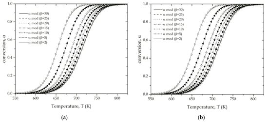 For many reaction models, the second term in the right-hand side of Equation (40) is constant [39], thus suggesting that a simple plot of versus 1/Tm, at different heating rates , yields a linear plot whose slope is −Ea/R. If the term is dependent on the heating rate, then the linear relationship cannot be inferred, which represents a limitation of this method [40]. Table 3 summarizes the main results obtained in relation to Tm and the conversion for each Tm value (m). As it can be seen, the conversion at the peak temperature is almost identical with an average value for the different heating rates of 0.531 ± 0.004.