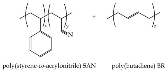 A recycled acrylonitrile-butadiene-styrene (ABS) obtained from waste electric-electronics equipment (WEEE) was used as the base material for kinetic analysis. This ABS grade is a binary blend of SAN and BR. Its characteristic glass transition temperature (Tg) is located at 104.4 °C. The melt flow index (MFI) is 7.7 g/10 min, measured at 210 °C and a load of 5 kg, and 20.5 g/10 min, measured at 230 °C and a load of 5 kg in a ATF Faar S.p.A. melt flow index (MFI) (Novegro-Tregarezzo, Italy). Scheme 1 shows a plot of the structure of this polymer blend.