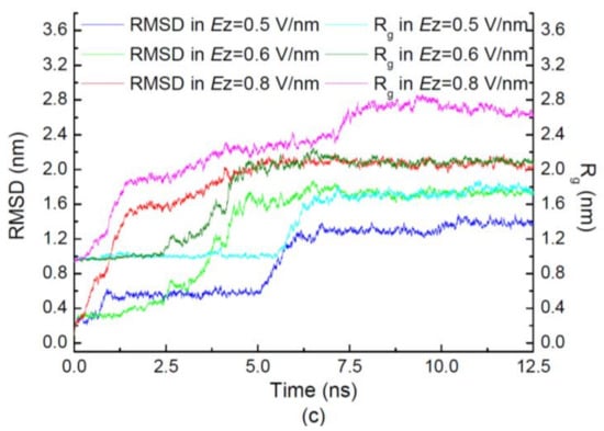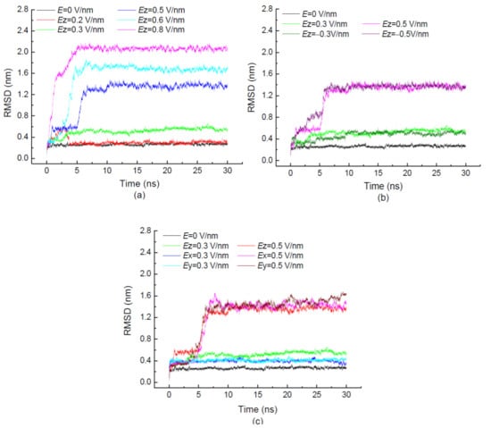 In order to investigate the effect of electric directionality on the protein sample, the simulations were performed with the same intensity of electric fields applied along opposite z-directions in Figure 1b, and along three different directions in Figure 1c. Figure 1b,c present the values of RMSD with the same intensity of the electric field applied in different directions. The average value of RMSD is increasing with the strength of the electric field. However, it is independent of the direction in which the external field was applied. It means that the protein 1BBL was rotated by the electric field. The obvious RMSD jumps during the simulation process are shown in the simulation case with the electric strength E ≥ 0.5 V/nm. The same characteristic time indicates that the structural change of the protein is related to the strength rather than the direction of the electric field.