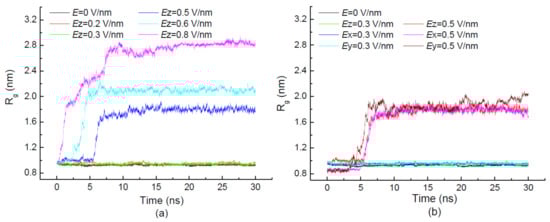 The time evolution of the radius of gyration of 1BBL exposed in the applied electric fields with different strengths and different directions are shown in Figure 2. Figure 2a,b show that the average value of Rg slightly increases with the strength of electric field E ≤ 0.3 V/nm. With the intensity of electric field continuing to increase, the values of Rg become more and more remarkable when 1BBL is exposed in the electric fields where E ≥ 0.5 V/nm. The reason partly lies in the stretching of the protein along the direction in which the electric field is applied. The average value of a radius of gyration Rg over the simulation period from 10 ns to 30 ns increases from 0.93 nm to 2.78 nm with the increasing strength of the external field along the z-direction in Figure 2a. The visible jumps in the Rg values also occur within 10 ns during the simulation process. It indicates the conformational transition of the 1BBL sample when it was exposed in the sufficiently high electric field. Figure 2a also shows that the characteristic time at which the jump occurs in the curve of Rg decreased with increasing electric strength. It presents the same tendency as the time evolution of RMSD values in Figure 1a. The short characteristic time of Rg indicates that the rapidly conformational transition of the protein 1BBL happened.