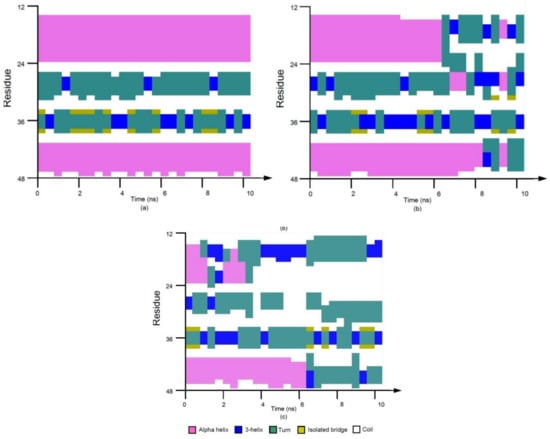 The stride evolutions of secondary structures of 1BBL with different electric field strengths in the initial 10-ns MD simulation processes are shown in Figure 3. The time evolution of the secondary structure was obtained from the protein sample 1BBL, which was subjected to the electric field applied along the z-direction with the strength Ez = 0.5 and 0.6 V/nm (Figure 3b,c) and E = 0 as the reference state (Figure 3a). Focusing on the residues from No. 15 to 23 (labeled as fragment I) and No. 41 to 47 (labeled as fragment II) in Figure 3a, most residues are assigned a purple color, which indicates that the secondary structure of these two fragments remain alpha helices during the simulation process performed without an external electric field. With the effect of the external electric field, secondary structural transitions of 1BBL occur in both fragment I and II (see Figure 3b,c). As seen in the graphs, the fragments I and II, which originally formed as helical regions (purple), deconstruct as turns or random coils (cyan or white color). The conformational change in fragment I is earlier and more drastic than that in fragment II. Comparing the time evolution of the secondary structure in Figure 3b,c, the simulation results clearly present that the time when the structural transition starts decreases with the increasing strength of the applied electric field. The tendency is as same as the time evolution curve of the RMSD and Rg shown in Figure 1 and Figure 2. The secondary structural analysis in Figure 3 also presents that the number of amino acids involved in the formation of turns and random coils increases with the increasing strength of the external electric field. It means that the stretch of the protein by an external field leads to destabilizing the conformation. This behavior can be attributed to the despiralization of the helix structure to the turns and random coils when the protein was subjected to an electric field.