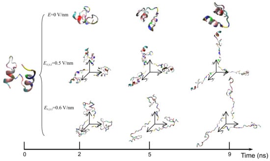 (Colored) Typical conformation of the protein 1BBL exposed in the electric fields with the strength Ex,y,z = 0 V/nm, 0.5 V/nm, and 0.6 V/nm during the simulation process, respectively.