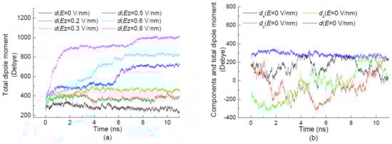 With the effect of electric fields applied along different directions, the three components and total dipole moment of 1BBL as a function of the simulation time are shown in Figure 5. Figure 5a presents the time evolutions of the total dipole moment during the initial 10-ns simulation when the protein sample was exposed in the electric fields and without the electric field as the reference state. As seen in Figure 5a, a significant rise is observed in the curve of the total dipole moment with the increase of the electric strength. The general effect of applied electric fields on the dipole moment is to increase its magnitude, whose extent becomes more pronounced in the higher electric fields. The curves also present the good coherence with the tendency of RMSD and Rg changing over the simulation time. The visible jumps in the curve of the total dipole moment are observed when 1BBL was exposed in the electric field with the strength Ez ≥ 0.5 V/nm. The time at which the jump occurs during the simulation process decreases with the increasing strength of the applied electric field. It means that the higher strength of the electric field induces the earlier achievement to the plateau of the total dipole moment.