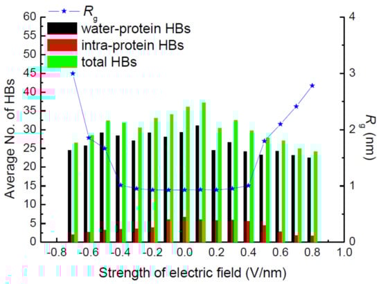 Hydrogen bonds (HBs) play a significant role in stabilizing the secondary structure of proteins. Then, the correlation of hydrogen bonds with structural parameters such as Rg was analyzed under the various simulation conditions. Figure 6 presents the electric strength dependence of the average number of total HBs, including intra-protein and water–protein types. The average numbers of HBs are the mean of the data over the last 10-ns MD simulations. As shown in Figure 6, the average number of water–protein HBs is several times higher than that of intra-protein HBs. Then, the change of the total number of HBs is dominated by the numerical variation of water-protein HBs. Regarding the view of the electric strength dependency of intra-protein HBs, the clear trend that the average number decreases with the increasing amplitude of the electric field is observed in Figure 6. It demonstrates that the number of intra-protein HBs presents a closer relation with the structural properties of the protein. The structural stability mostly depends on the interactions between amino acids in the formation of secondary structures via HBs, especially intra-protein HBs. Comparing the curve of radius of gyration Rg and the number of average intra-protein HBs as the function of different electric strengths, the opposite trend is observed, i.e., the increasing value of Rg is corresponding to the decreasing number of intra-protein HBs simultaneously when the protein is exposed in the higher electric field, which manifests the deconstruction of intra-protein HBs when the protein is stretched along the same direction as the electric field that is applied. The lower value of Rg could be attributed to the construction of HBs involving intra-protein atoms. It verifies that HBs, especially intra-protein types, play the vital effect on promoting the stability of the protein.