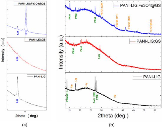 X-ray diffraction (XRD) patterns of polyaniline grafted lignin (PANI-LIG)-based coatings, corresponding to 7.5 to 13° (a) and 13 to 58° (b) diffraction angle regions, respectively.