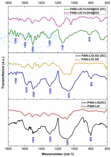 Fourier transform infrared spectroscopy (FTIR) spectra of PANI-LIG-based coatings.