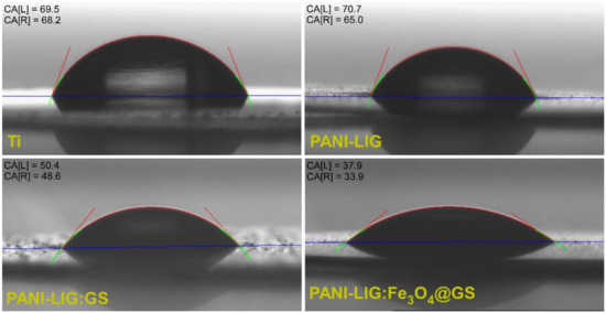 CA average values are found in Table 2 meanwhile typical CA images for water drop evolution in time for PANI-LIG, antibiotic–polymer and magnetic functionalized antibiotic–polymer coatings are reported in Figure 5.