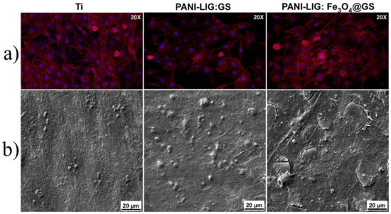 Cell stocks were cultured in Eagle’s MEM- Biochrom, supplemented with 10% FBS, 1% L-glutamine, 1% P/S, and 1% NEAA at 37 °C and kept in standard conditions of temperature and humidity (37 °C, 5% CO2) until they reached confluence. Afterwards, they were detached using 1% Trypsin, seeded at a density of 10,000 cells/sample onto the PANI-LIG substrates. These were further incubated in standard conditions, during 48 h, to examine the morphological behavior of the osteoblast-like MG-63 cells [41]. The metabolic activity of the cells after being in contact with the PANI-LIG substrates was measured using the MTS tetrazolium salt viability assay (CellTiter96® Aqueous One Solution Cell Proliferation Assay) as in [42]. Results were presented as reported to control’s absorbance (Ti). An immunofluorescence assay was employed to reveal the morphology and integrity of the cytoskeleton of the cells after being in contact with PANI-LIG substrates. For this, Texas RedTM–phalloidin was used to mark the actin filaments, while Hoechst was used as counterstaining of nuclei. Fixing and staining of the samples for fluorescence microscopy was done as in [42]). The images were acquired using a BX41 fluorescence microscope from Olympus (New York, NY, USA). The SEM morphology investigations were performed to obtain complementary and more detailed information on the behavior of the MG-63 cells at interaction with the previously obtained thin coatings. Investigations were done after 48 h of incubation, and the substrates were cultured as for fluorescence microscopy investigations. The samples were fixed and prepared for SEM as in [42] and [43].