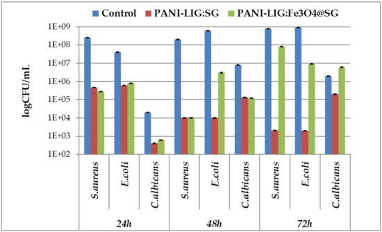 Biofilm formation on the materials was assessed after incubation for distinctive periods, by the viable cell count (VCC) method. Concretely, after the incubation period, the samples containing attached pathogenic organisms were gently washed with sterile physiological PBS and transferred into a new sterile tube, containing 1 mL of fresh and sterile nutrient broth and vigorously vortexed for 30 s to detach the biofilm-embedded cells. The obtained cellular suspensions (PBS suspensions containing detached bacterial and fungal cells, respectively) were then serially diluted, and each dilution was spot-inoculated onto nutritive agar, to achieve microbial growth and to estimate the number of colony forming units (CFU)/mL [46]. Experiments were performed in triplicate.