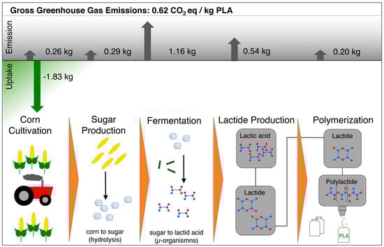 Steps of polylactide (PLA) production with greenhouse gas uptake and emissions for 1 kg of PLA (based on the data of Reference [4]).