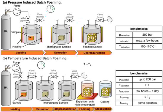 Principles of (a) pressure-induced batch foaming (at the top), and (b) temperature-induced batch foaming (at the bottom). For orientation, some benchmark parameters are given (note: for more detailed experimental set-up and parameters, please consult the literature).