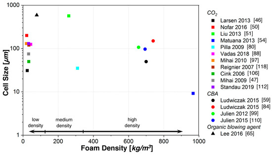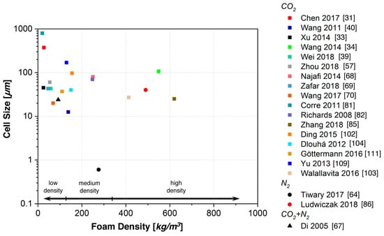 Overview of the literature on batch-foamed PLA (lowest density values with corresponding cell sizes within the given range were considered).
