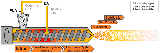 Biopolymers comprise polymers that are either (i) bio-based and biodegradable or (ii) bio-based but non-degradable (so-called drop-ins), as well as (iii) those fossil-based polymers that are biodegradable. Currently, the drop-ins hold the biggest market share for biopolymers, i.e., bio-PET (e.g., polyethylene terephthalate from SCG Chemicals Co., Ltd.), bio-PA (e.g., polyamide from Evonik Industries AG) bio-PE, and bio-PP (e.g., polyethylene and polypropylene both from Braskem S.A.). PLA and starch are the most important biopolymers that are bio-based and biodegradable, each with a global production of roughly 200,000 t/y [11]. PLA is well known as the most promising bio-based and biodegradable polymer with properties and processability that come close to those of (i) PS [6,12,13] and (ii) polyvinyl chloride (PVC), PE, or PP when plasticized with its own monomers [12]. Up to now, PLA can be found in a lot of products such as disposable cups, dishes, cutlery, bottles, wovens, and electronics [3,14]. Furthermore, because of its biocompatibility and biodegradability, it is well suitable for medical applications [8,15]. An initial work on foaming of PLA was conducted with the batch foam method in 1996 by Mooney et al. [16]. The foam extrusion of PLA (in combination with starch) is another early approach, which was carried out by Fang et al. [17] in 2000. Since then, a lot of research was done on foaming of PLA and, in the last few years, PLA foams were even established commercially, such as thermoformed extrusion sheet foams from Sealed Air Corp. (Cryovac NatureTRAYTM) [18], as well as bead foams from the companies Synbra Technology BV (BioFoam®) [19] and BASF SE (ecovio®EA) [20,21].