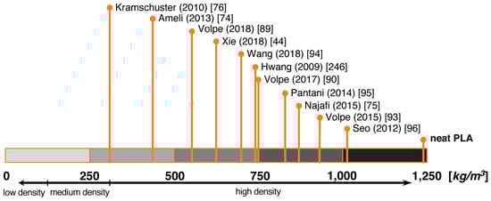 A conclusive visualization of the densities and cell sizes from works on extrusion foams is given in Figure 5. For PLA, rather lower expansion can be expected with chemical blowing agents because of the limited gas yield. Consequently, only a few reports were done, mainly with azodicarbonamide (ADC) [43,59,60,84,99,110]. Also, nitrogen is rarely applied as a blowing agent for PLA and rather less expansion was achieved [61]. Another work reports the use of a combination of CO2 and nitrogen resulting in foamed sheets with densities down to 350 kg/m3 [54]. Furthermore, some works with organic blowing agents such as iso-butane [65] or n-pentane [18] can be found, reporting foams with minimum densities of 78 and 38 kg/m3, respectively.