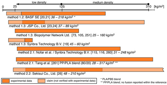 Polymer foaming can be carried out by batch processing (i.e., in an autoclave), foam extrusion, foam injection molding, or bead foaming. All methods were applied to PLA. Detailed explanations of the physical background were reviewed extensively before [236,237,238,239]. This review should give an overview of foam densities and cell sizes achieved with PLA. The density is distinguished in terms of volume expansion rate (VER) as high (VER ≤ 4), medium (VER ≥ 4–10), and low (VER ≥ 10–50), as was done by a former review of Okolieocha et al. [236]. Assuming a raw density of 1.240 kg/m3 for PLA, this means a foam density above 310 kg/m3 is defined as high, while low foam densities are below 124 kg/m3, and medium densities can be found in between. Frequently used definitions to express the foam expansion are listed in Table 3. In the paragraphs, the data from literature are unified to absolute values in kg/m3 for comparison.