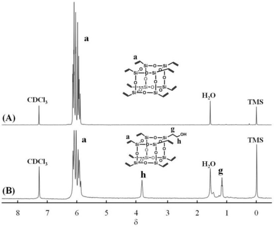 1H NMR spectra of (A) OctavinylPOSS (OVPOSS) and (B) VPOSS-OH in CDCl3.