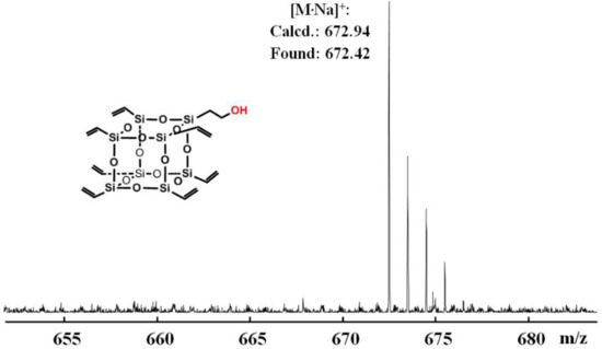 The whole synthetic approach shown in Scheme 1 was designed in an effort to achieve giant surfactants with desirable structure and diverse functions using simple reactions and readily available starting chemicals. From the commercially available octavinylPOSS, the monohydroxyl and heptavinyl functionalized VPOSS-OH was easily obtained in an acceptable yield, with all the characterizations consistent with the literature. As shown in Figure 1, the characteristic signals of vinyl protons appeared at δ 5.75–6.25 ppm. After the formation of VPOSS-OH, most of the vinyl protons remained at the same chemical shift and two new peaks could be found at δ 1.1 ppm and δ 3.8 ppm that were ascribed to the methylenes adjacent to hydroxyl group. Moreover, the molecule was also characterized by MALDI-TOF mass spectroscopy, and the result is displayed in Figure 2. It was found that the observed molecular weight (m/z = 672.42 Da) for (M∙Na)+ (C16H26O13Si8Na+) was in excellent agreement with the calculated one (m/z = 672.94 Da).