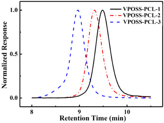 Gel permeation chromatography (GPC) traces of VPOSS-PCL samples (VPOSS-PCL-1: Mn, GPC = 3800 g/mol, Mw/Mn = 1.09; VPOSS-PCL-2: Mn, GPC = 5000 g/mol, Mw/Mn = 1.07; VPOSS-PCL-3: Mn, GPC = 7700 g/mol, Mw/Mn = 1.11).