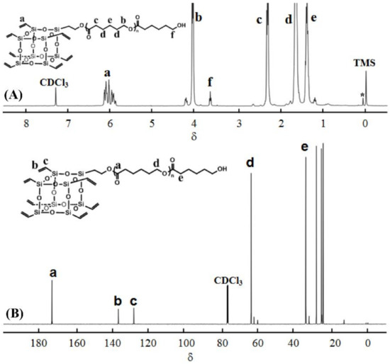 1H NMR spectrum (A) and 13C NMR spectrum (B) of VPOSS-PCL-3 in CDCl3. Asterisk represents resonance from residual silicone grease.