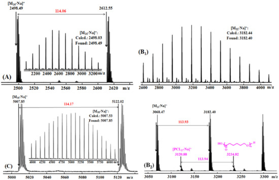 MALDI-TOF MS spectra of (A) VPOSS-PCL-1, (B) VPOSS-PCL-2 (B2 is the enlarged image of B1), and (C) VPOSS-PCL-3.