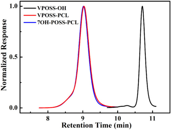 GPC traces of VPOSS-OH (Mn, GPC = 900 g/mol, Mw/Mn = 1.14), VPOSS-PCL-3 (Mn, GPC = 7700 g/mol, Mw/Mn = 1.11), and 7OH-POSS-PCL-3 (Mn, GPC = 7900 g/mol, Mw/Mn = 1.10).