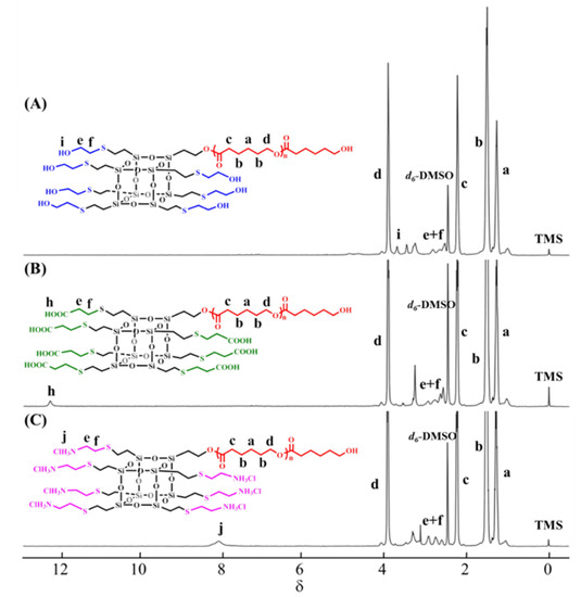 1H NMR spectra of (A) 7OH-POSS-PCL-3, (B) 7COOH-POSS-PCL-3, and (C) 7NH3Cl-POSS-PCL-3 in d6-DMSO.