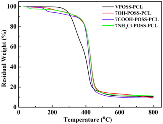 TGA thermograms of VPOSS-PCL-3, as well as the corresponding giant surfactants 7OH-POSS-PCL-3, 7COOH-POSS-PCL-3, and 7NH3Cl-POSS-PCL-3.