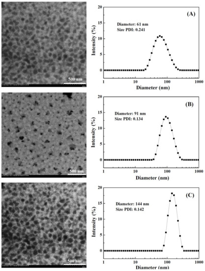 TEM images (scale bars represent 500 nm) and plots of particle size distributions of nanoparticles formed from (A) 7OH-POSS-PCL, (B) 7COOH-POSS-PCL, and (C) 7NH3Cl-POSS-PCL in aqueous solution with a concentration of 0.2 mg/mL.