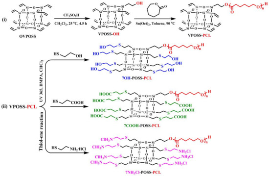 Synthetic routes of single-tailed giant surfactants 7R-polyhedral oligomeric silsesquioxane (POSS)-poly(ε-caprolactone) (PCL) (R = OH, COOH, and NH3Cl) via a combination of ring-opening polymerization (ROP) and thiol-ene “click” reaction.