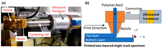 Figure 1 is the configuration where two-layered single-track specimens were printed on a gantry style 3D printer (MakerGear M2, MakerGear LLC, Beachwood, OH, USA), modified to allow ultrasound vibrations to be incorporated into the extruded filament. Each specimen has two single tracks one on top of the other. Acrylonitrile Butadiene Styrene (ABS) filament feedstocks of 1.75 mm-diameter and a 0.87 mm-diameter nozzle (measured using optical microscope, Hatchbox 3D, Pomona, CA, USA) were used for printing all specimens. The temperatures for the extruder/build plate and print speed settings were 190 °C/90 °C at 200 mm/min respectively. Both top and bottom tracks in a given specimen were printed in the same direction (from +