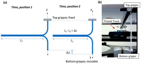 The separation/peeling forces and the corresponding adhesion energy of the bonds between the printed two-layer tracks were measured by adopting the technique of the ASTM F88 Peel Test. This standard system is typically used to measure the adhesive force between two sealed flexible bands. This is an appropriate method of testing adhesion energy in this study since it applies to flexible specimens, allowing for a spatial view of adhesion between two layers (as compared with tensile testing where the measured strength corresponds to the lowest of a series of interfaces).