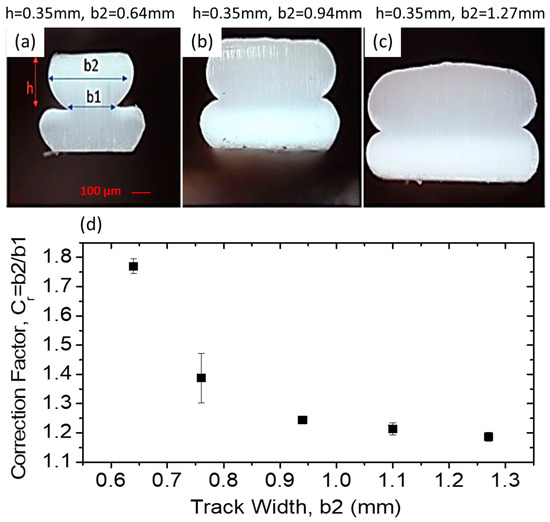 Figure 3a–c shows three representative images of track cross section for fixed height (0.35 mm) and varying width (