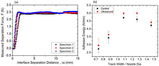 Figure 4b also shows that as the track width–nozzle ratio increases, the effect of ultrasonic vibrations becomes more consistent and observable. The authors attribute this to the increases in the relaxation of the stretched polymer chains during higher shear as the width increases. As discussed earlier, ultrasonic vibration reduces polymer melt viscosity due to increased relaxation, it is conceivable that as the shear in the polymer increases due to the larger track widths at the same height, the increased polymer stretching would also allow an increase in relaxation. In the three-stages of the polymer interface healing process, increased relaxation combined with increased reptation results in an increasing degree of entanglement in the interface region. The result is an increase in the interfacial adhesion. As eluded in the experimental section, in order to de-couple the effect of heat from ultrasonic vibrations on the rheology and interlayer-adhesion, out-of-resonance excitation conditions are avoided. Therefore, to examine the effect of frequency, modifications to the physical system to ensure resonance is required. This is currently being investigated by the authors. As part of on-going work, both longitudinal and transverse modes of vibration will be investigated. The effect of frequency, power, and material on the microstructure of the polymer near the interfacial regions will also be investigated.