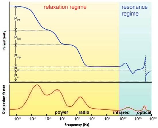 Types of polarization versus frequency in polymers. Pe: electronic polarization; Pat: atomic polarization; Pdip: (dipolar) orientational polarization; Pion: ionic polarization and Pint: interfacial polarization. The top panel shows the real part of the dielectric constant (ε′), and the bottom panel shows the imaginary component of the dielectric constant (dissipation factor, ε″). Reprinted with permission from reference []. Copyright 2012, American Chemical Society.