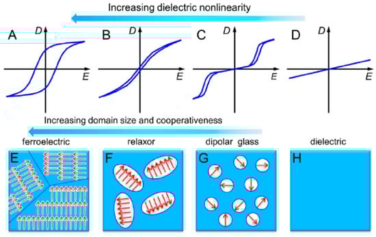Representative illustrations of the hysteresis loops for (A) ferroelectric, (B) relaxor ferroelectric, (C) dipolar glass and (D) dielectric materials. The physical phenomena associated with these behaviors are represented in (E) to (H), respectively. Note that from (E) to (H), the polar domain size gradually decreases. Reprinted with permission from reference []. Copyright 2013, Elsevier.