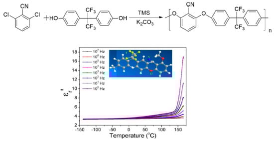 Components of the dielectric constant (ε′r) as a function of temperature at different frequencies for fluorinated and cyanated poly(arylene ether nitrile). Adapted from reference [] with permission. Copyright 2018, Wiley.