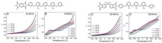 Dependence of the real part of the relative permittivity (ε′) and dielectric loss (ε″) on the temperature for poly(amide) samples under a high-strength electric field with peak amplitudes of 10 MV m−1 and 50 MV m−1. Adapted from reference [] with permission. Copyright 2014, Royal Society of Chemistry.