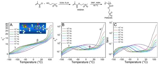 (A) Real (ε′r) and (B) imaginary (ε″r) parts of the relative permittivities and (C) dissipation factors (tan δ) as a function of temperature at different frequencies for PMSEMA. Adapted from reference [] with permission. Copyright 2015, American Chemical Society.
