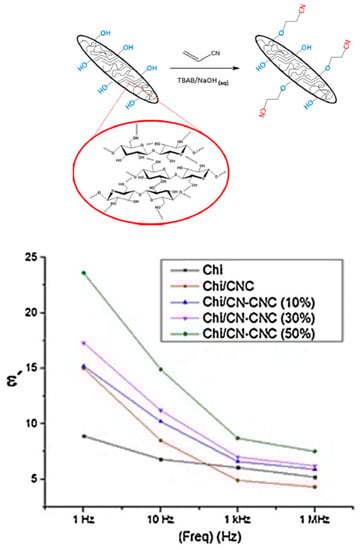 ε′ values at different frequencies for chitosan, the nanocomposite with unmodified CNCs and those with different amounts of cyanoethylation of cellulose nanocrystals (CN-CNC). Adapted from reference [] with permission. Copyright 2018, Elsevier.