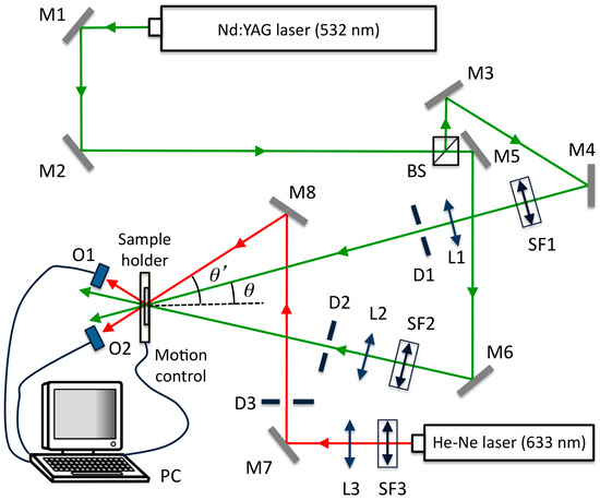 We use the holographic set up shown in Figure 1. The devices prepared were exposed to a diode-pumped solid-state laser from MKS Instruments, Inc. (Spectra-Physics Excelsior One 532 multi mode, MA, USA) with a wavelength of 532 nm in order to record an unslanted diffraction grating in the HPDLC device. The laser beam with TE polarization was separated into two beams with a light intensity ratio of 1:1. We used lenses and spatial filters to obtain two beams with a diameter of 1 cm. The object and reference beams were recombined on the sample at an angle θ = 16.0° to the normal using mirrors. The spatial frequency was 1036 lines/mm. The working light intensity was 2.2 mW/cm2. The diffracted and transmitted intensity were monitored in real time with a 632.8 nm He-Ne laser positioned at Bragg’s angle θ‘ = 19.1° where the material is not sensitive [33]. During the recording, the temperature was 22 °C and the recording time was adjusted to 40 s after an optimization process to obtain the maximum diffraction efficiency without overmodulation.