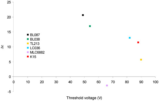 Figure 4 shows the Δε versus the threshold voltage. It is observed that for LC with Δε > 0 (Table 1), this value decreases when the threshold voltage is increased. MLC6882 has a different behavior due to Δε < 0.
