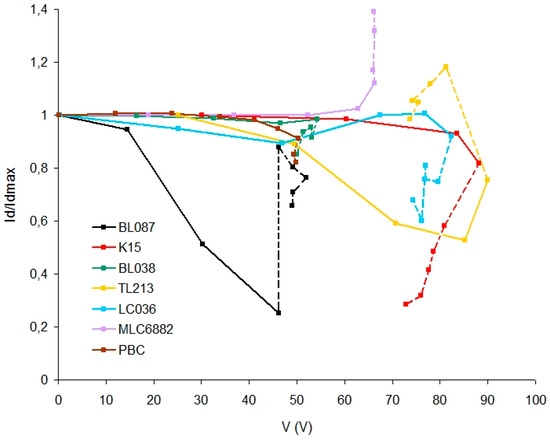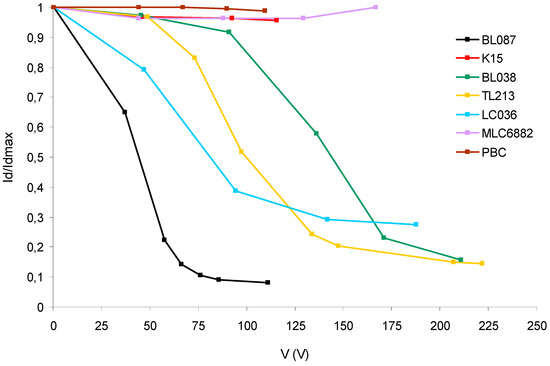 K15 and PBC are liquid crystals with only one nematic molecule unlike the rest of the LC studied. The result shows a decrease of less than 4% for Id/Idmax with a voltage around 100 V in both LC. It is a much lower decrease than those obtained for the rest of the LC with Δε > 0.