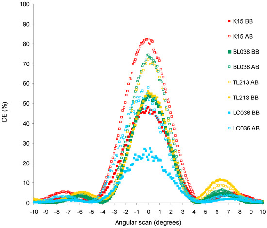 Related to the reconstruction of the holograms without applying an electric field, we found experimentally that each device with different LC obtains a different DEmax (Figure 7). Therefore, there is a direct relationship between the DEmax obtained and the LC used. The DEmax is related to the refractive index modulation according to Kogelnik equation [33]. Each LC has a different Δn value (Table 1) and a LC with high Δn obtains a high refractive index modulation during the holographic recording and therefore a high DEmax according to Kogelnik equation.