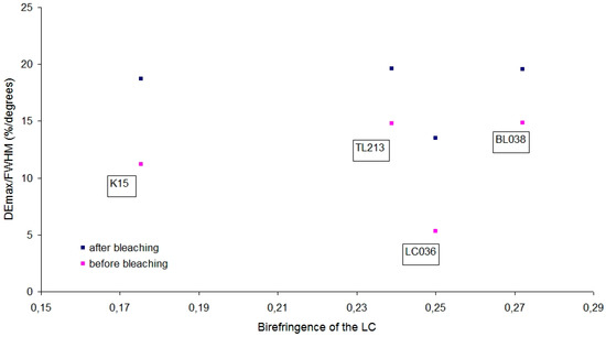 To understand the results from Figure 7, avoiding differences in the width of the curves, the full width at half maximum (FWHM) of each graph has been calculated. Figure 8 shows the maximum diffraction efficiency (DEmax) divided by the FWHM versus the birefringence of the corresponding LC (Table 1) of each graph in Figure 7.