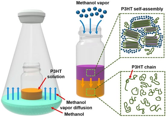 The facile synthetic procedure for self-assembled P3HT nanofibers via solvent vapor treatment is illustrated in Figure 1. The illustration highlights the exposure of a P3HT solution to a non-solvent vapor for precisely controlling the assembly of P3HT in solution. Specifically, a vial filled with a P3HT/chloroform solution (3 mg/mL) was placed in a glass bottle containing the volatile non-solvent, methanol. As the non-solvent methanol vapors diffused into the P3HT solution in the vial, the formation of one-dimensional P3HT aggregates occurred via π−π stacking between P3HT chains, minimizing the unfavorable interactions between the polymer chains and methanol molecules [21,22].
