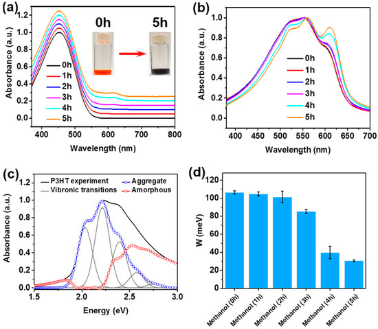 Normalized ultraviolet-visible (UV-vis) absorption spectra of P3HT (a) solution and (b) corresponding films, as functions of methanol vapor exposure time. The spectra were shifted vertically for better comparison. (c) Absorption spectrum of the P3HT film deposited from the solutions exposed to methanol vapor for 3 h, after being subjected to the Spano analysis using Equation (1). (d) Changes in exciton bandwidth (W) of P3HT films as a function of methanol vapor exposure time.